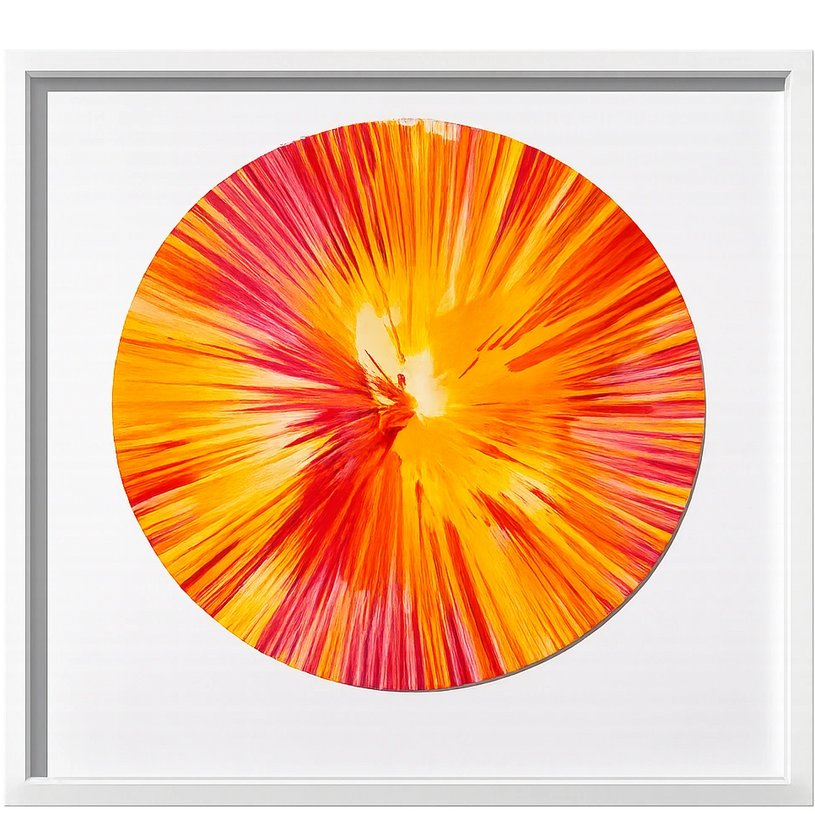 The 'Spin' paintings, made in 2009 for the PinchukArtCentre, are a celebration of colour, motion and chance. Created by splattering paint onto a spinning canvas, they symbolise the chaotic and random nature of life. Hirst's intention was to challenge the traditional methods of painting, focusing on chance and the physical act of creation, leading to unique and unpredictable results.